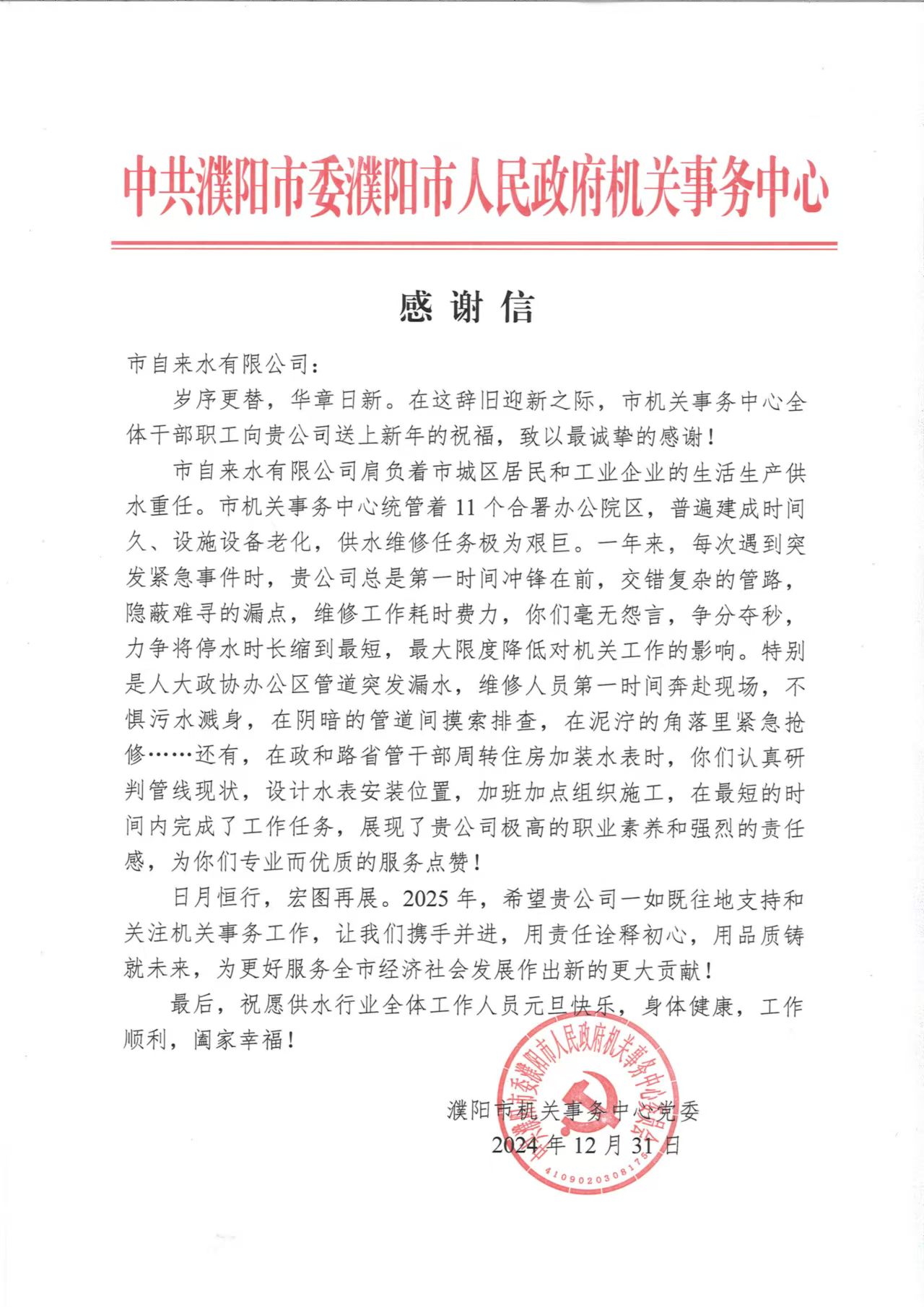 2024年的最后一天,公司收到了一封来自中共濮阳市委濮阳市人民政府机关事务中心的感谢信,这封信如同冬日里的暖阳,让我们感到无比温暖。