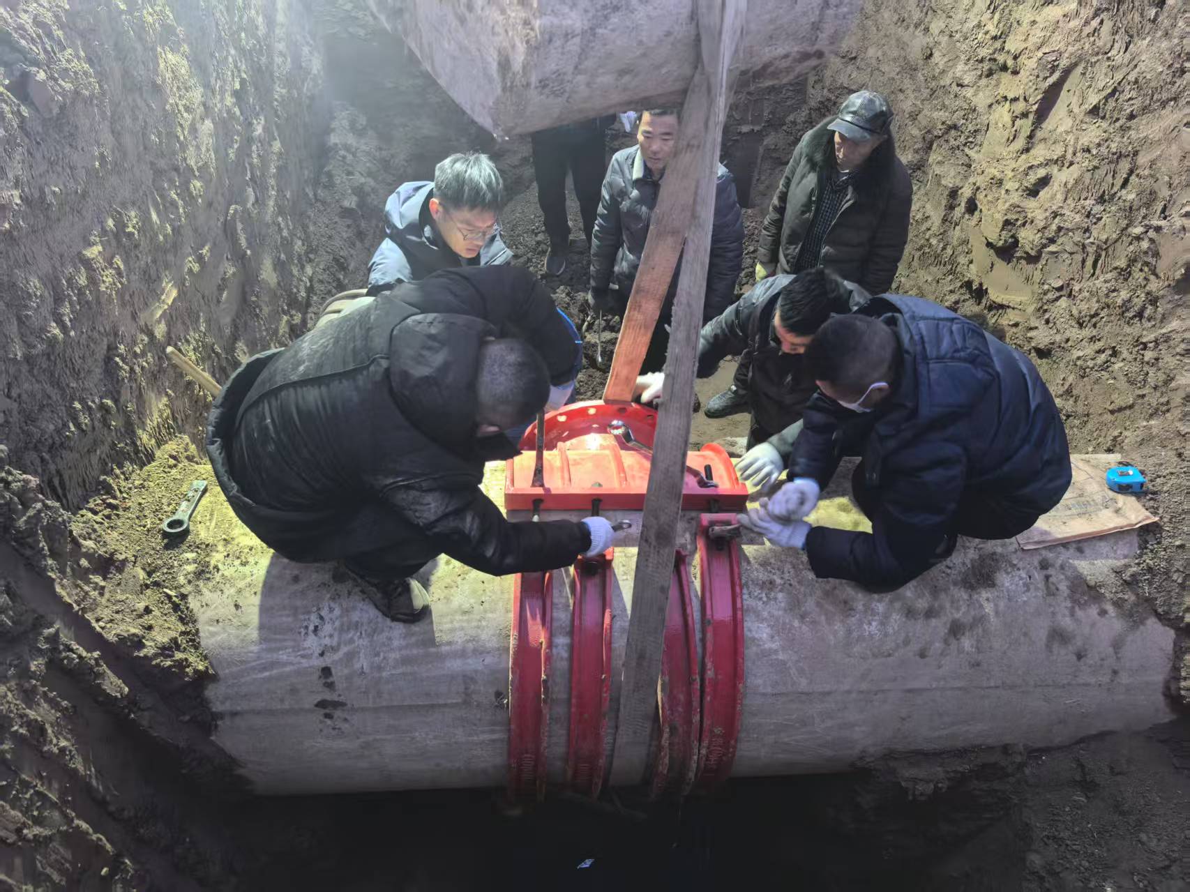 1月18日上午,抢修班组正式投入紧张作业。施工现场,大型挖掘机挥舞着钢铁巨臂,小心翼翼地进行土方开挖,每一下挖掘都精准而谨慎,避免对周边管线造成二次破坏。一根根粗壮的管道被有序运输至现场,抢修队员们紧密协作,有的负责指挥管道吊运,有的专注于管道对接。对于管径较大的管道,采用抱箍连接工艺,抢修队员们熟练地将抱箍精准套在管道连接处,反复检查确保密封牢固,每一颗螺丝的拧紧都凝聚着他们对工程质量的执着。