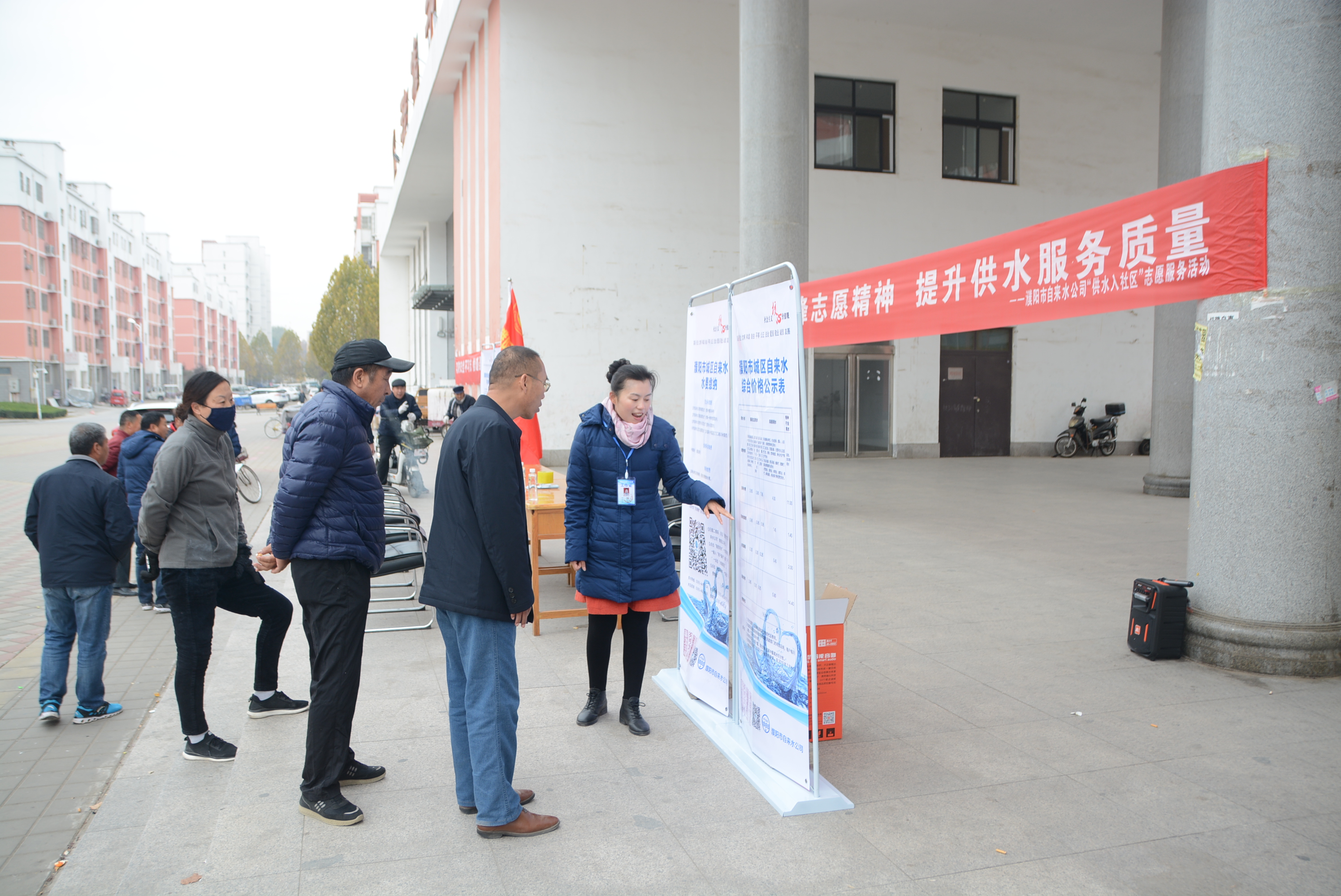 为扎实开展“不忘初心 牢记使命”主题教育,濮阳市自来水公司按照“守初心、担使命、尽职责、服好务”的部署要求,11月26日上午,皇甫营业所组织8名志愿服务人员到林海花园二期,开展“供水服务入社区”志愿服务活动,主动征求居民用户意见建议,认真查找自身工作中存在的短板和不足,下大力气提升服务质量。现场向小区居民讲解“濮阳市自来水公司”微信公众号操作使用,为居民用户讲解安全供水知识,宣传供水政策法规,解答用户咨询和疑难问题。4个工作组共接待用户咨询100余人次,发放供水服务指南100余份,指导用户使用微信公众号60余人次,解决用户家中问题9个,深受居民用户一致好评,以实际行动践行兴水为民的庄重承诺。