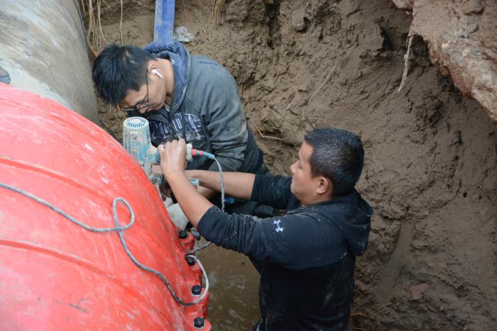 9点30分,挖掘机开挖部分完成,抢修人员跳下深坑,站在泥水中进行人工开挖。10点40分,作业面挖掘完成,漏水原因确认为DN1000管子胶圈损坏导致的。下午15点20分,大家合力将哈夫节抬到主管破损处进行修补,经过抢修人员的不停奋战,于16点50分将破损管道修补完成,并恢复了正常供水。