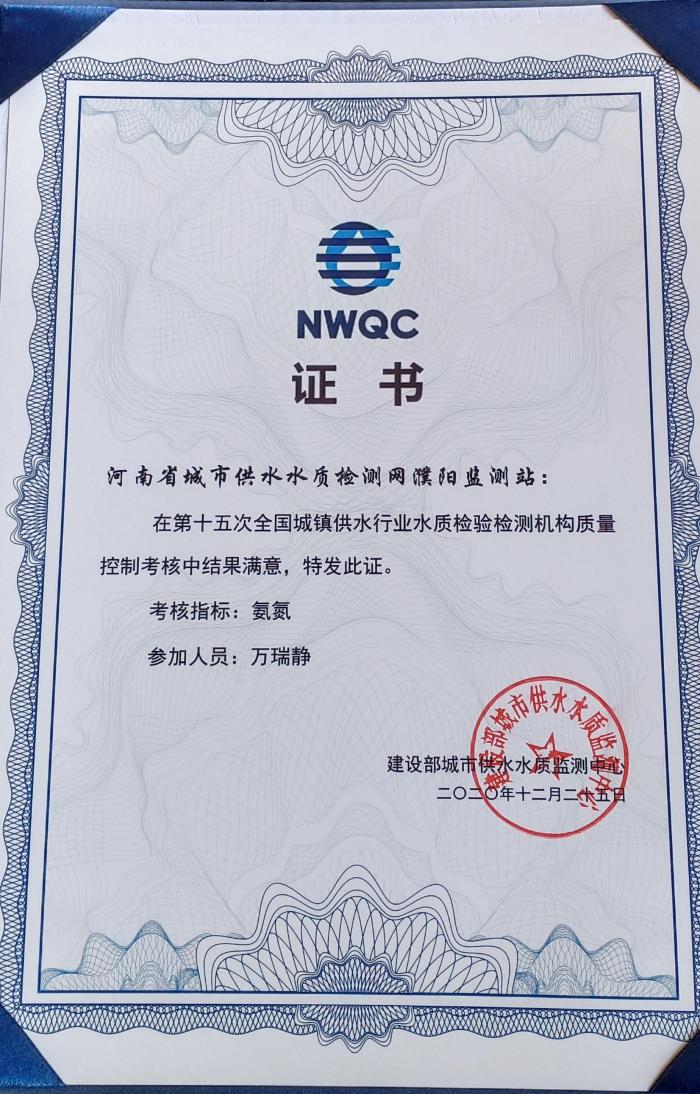 近日,由建设部城市供水水质监测中心组织的第15次全国城镇供水行业水质检验检测机构质量控制考核结果反馈,濮阳市自来水公司水质监测中心参加考核的“生活饮用水中氨氮”指标2个样品均获满意结果,顺利通过全国质量控制考核。