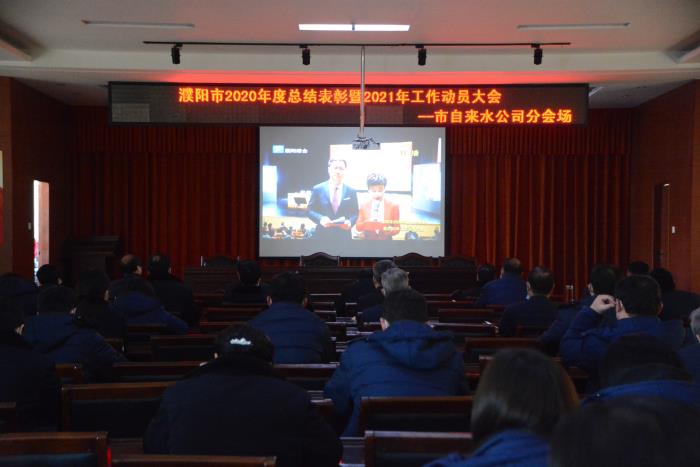初心呼唤担当,使命催人奋进。2月20日,濮阳市自来水公司设分会场,组织机关科室和二级单位负责人90余人集中收看濮阳市2020年度总结表彰暨2021年工作动员大会实况直播。大会全面回顾总结了过去一年濮阳市主要工作成效,表彰奖励在各条战线做出突出贡献的先进单位和个人,并安排部署了新一年工作任务。上午9时30分,直播一开始,在座的每一位干部职工边听边记,切实把精神吃透、领会透。