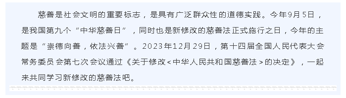 为方便大家学习,根据《全国人民代表大会常务委员会三亿网站修改<中华人民共和国慈善法>的决定》,小编特将此次修改的主要内容做了标红注明。
