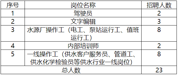 因工作需要,依据《濮阳市自来水公司人员招聘管理办法》,濮阳市兴水物业管理有限公司面向社会公开招聘驾驶员、文字编辑、水源厂操作工、内部培训师、一线操作工等工作人员若干名。现将有关事项公告如下: