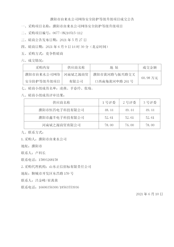 濮阳市自来水公司网络安全防护等级升级项目成交公告