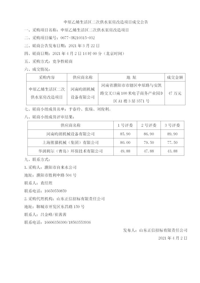 中原乙烯生活区二次供水泵房改造项目成交公告
