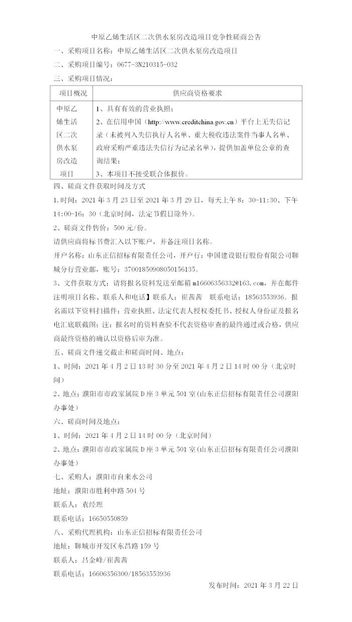中原乙烯生活区二次供水泵房改造项目竞争性磋商公告