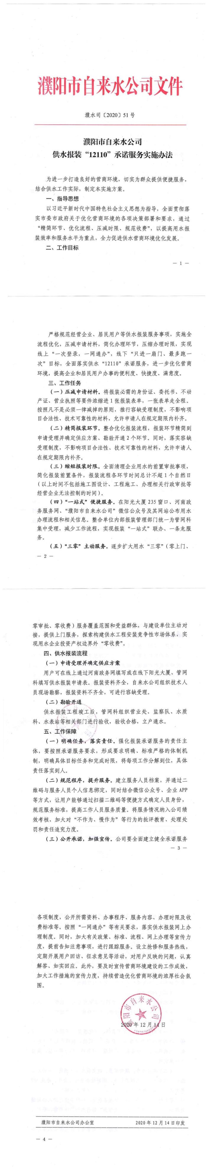 濮阳市自来水公司供水报装“12110”承诺服务实施办法